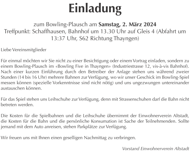 • Einladung zum Bowling-Plausch am Samstag, 2. März 2024